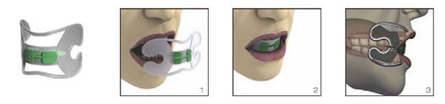3. Umieścić urządzenie w ustach pacjentach, kładąc relaksator mięsni w przedsionku jamy ustnej, na zewnątrz łuków zębowych. Płytka nagryzowa musi zostać umieszczona między dolnymi a górnymi siekaczami.